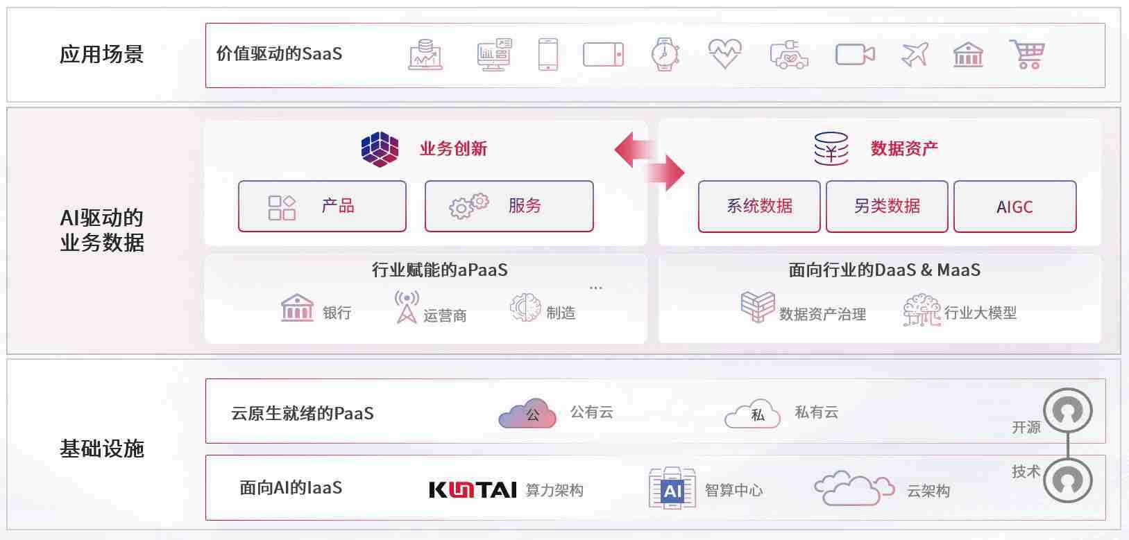 数字时代,,,,围绕企业数字化转型的关键要素,,,,z6com尊龙凯时数码开创性的提出数云融合战略和技术体系框架,,,,着力在云原生、、、、数字原生、、、、AI原生和信创产业上架构产品和服务能力,,,为处在不同数字化转型阶段的快消零售、、、、汽车、、金融、、医疗、、、政企、、、教育、、运营商等行业客户提供泛在的敏捷IT能力和融合的数据驱动能力,,,,构建跨界融合创新的数字业务场景和新业务模式,,,助力企业级客户建立面向未来的核心能力和竞争优势,,,全面推动社会的数字化、、、、智能化转型升级。。。。